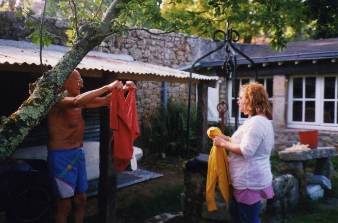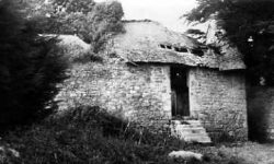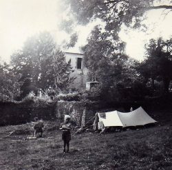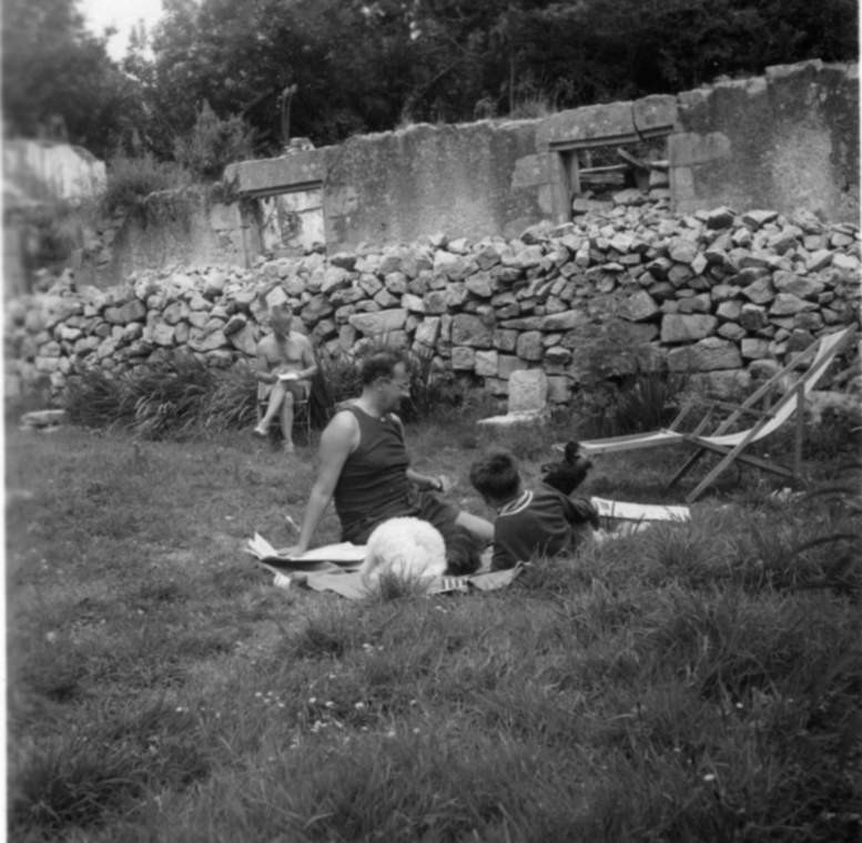 Le vent d’ouest poussera donc mes parents vers la côte est. Ils trouveront là un fermier compatissant, Monsieur Melec, qui les autorisera à s’installer dans un champ en contrebas de l’église et à bénéficier ainsi d’un accès direct à la plage ! Je conserve précieusement la photo où l’on voit la canadienne deux places où nous dormions tous les quatre. Derrière le vieux mur, il y a la pompe où nous prenions l’eau ; sur la tente, il y a les serviettes de bain et les couches en coton qui prennent le soleil ; au premier plan, il y a un petit garçon blond avec son filet à crevettes. Un peu en arrière, il y a mon père. Il est de dos, assis devant une sorte de table bricolée avec des cageots et des planches : il travaille ! Á l’arrière-plan, un grand bâtiment est ouvert à tous vents ; les Îlois l’appellent l’Arche de Noé car, après avoir été une école où l’on formait l’élite des futurs capitaines, il a abrité tout ce que l’île comptait de miséreux ; il dissimule derrière lui, une maison plus petite, mais encore plus ruinée si c’est possible, dont la façade donne directement sur la plage.
